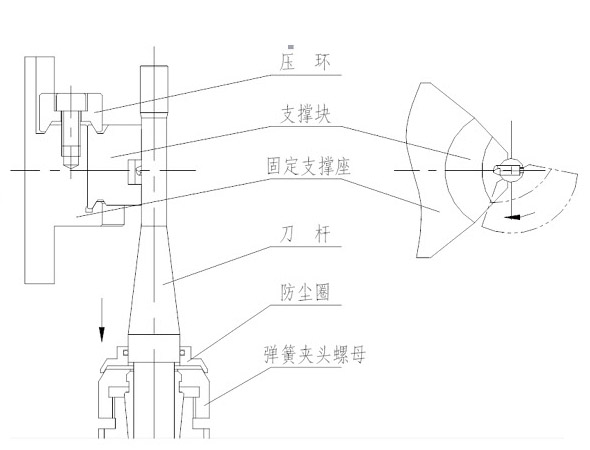 飞刀支撑结构借鉴了意大利的同类型机床的特点,支撑块采用圆弧面支撑,支撑效果好,同时在刀杆顶端用活动顶尖支撑,来提高刀杆的 支撑刚性和精度。